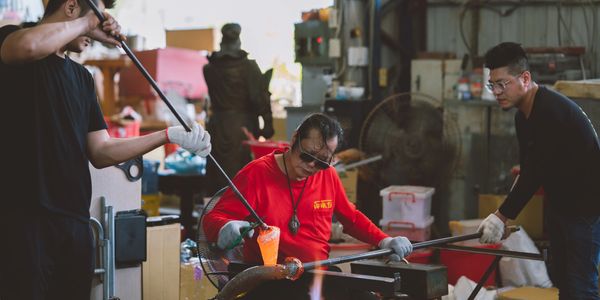 作品創作主要為玻璃融漿熱塑法,獨創以坩堝窯爐玻璃漿吹製及實心手工拉製,於1300度玻璃漿結合不同係數玻璃材質配色透過吹製及手工拉製塑型出各種不同風格的藝術品。
